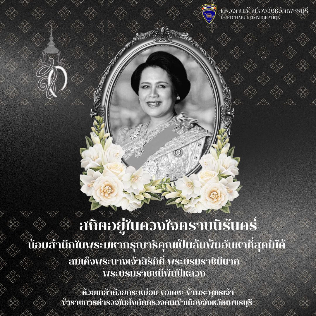 ธ สถิตในดวงใจไทยนิรันดร์ น้อมรำลึกถึงพระมหากรุณาธิคุณ และร่วมถวายความอาลัย สมเด็จพระนางเจ้าสิริกิติ์ พระบรมราชินีนาถ พระบรมราชชนนีพันปีหลวง ด้วยเกล้าด้วยกระหม่อมขอเดชะ ข้าพระพุทธเจ้า ข้าราชการตำรวจในสังกัดตรวจคนเข้าเมืองจังหวัดเพชรบุรี